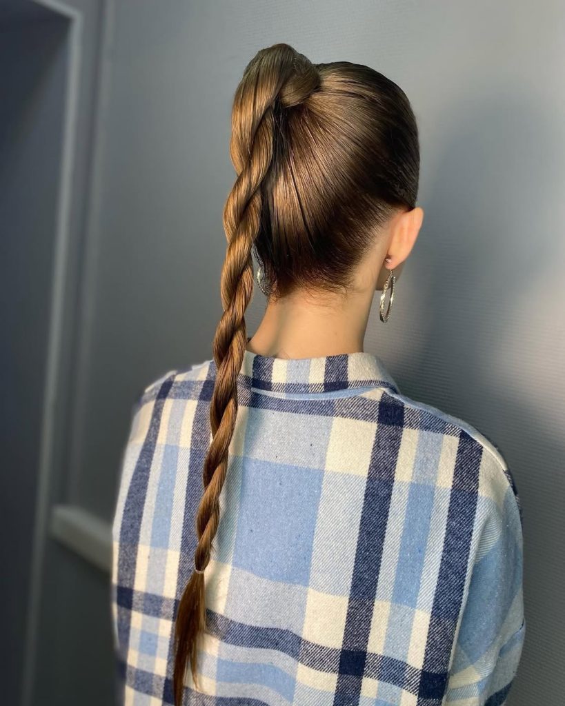 This braided ponytail introduces structure without stiffness. The scalp remains smooth and controlled, while the braid itself adds dimension and visual interest across the back. Greasy roots actually enhance this look, helping the braid stay tight and defined throughout the day.