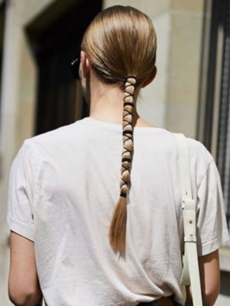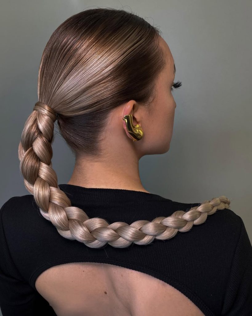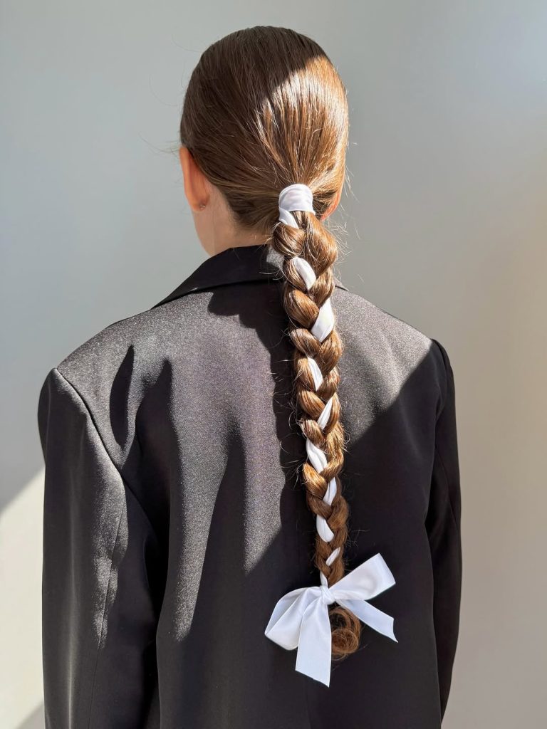 This braid incorporates a ribbon woven directly through the length, creating a graphic effect that feels editorial yet wearable. The sleek base benefits from greasy hair, which helps maintain smoothness without heavy styling products.