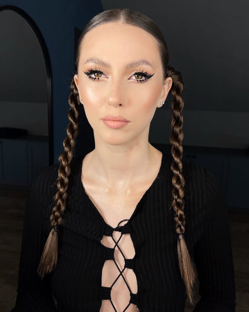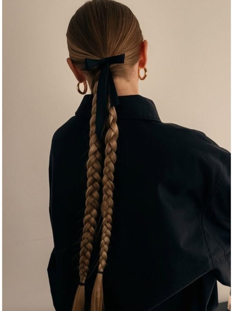 This double braid ponytail proves that greasy hair can look intentional rather than rushed. The roots are brushed back cleanly, while two narrow braids extend down the length, finished with a simple ribbon that adds softness without distraction.
