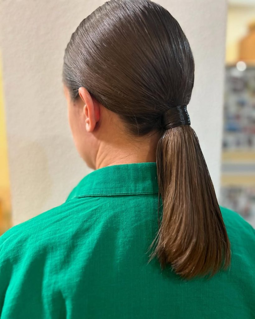 This low ponytail takes a more relaxed approach. Instead of pulling everything tight, the hair is smoothed back with gentle volume at the base, letting the texture do some of the work. It’s an ideal everyday style for school drop-offs, errands, or casual meetings.