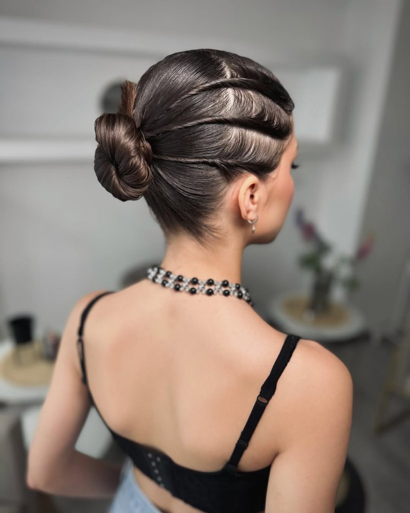 This bun takes greasy hair to a more architectural place. Braided sections are incorporated along the scalp, leading into a structured bun at the back. The result feels refined, deliberate, and undeniably striking.