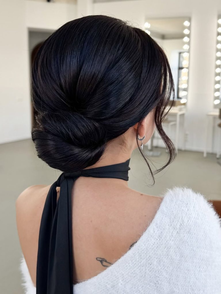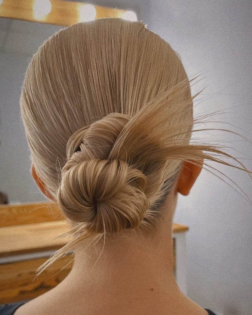 This sleek bun is timeless for a reason. The hair is smoothed back flawlessly and twisted into a compact shape that highlights the neck and shoulders.
