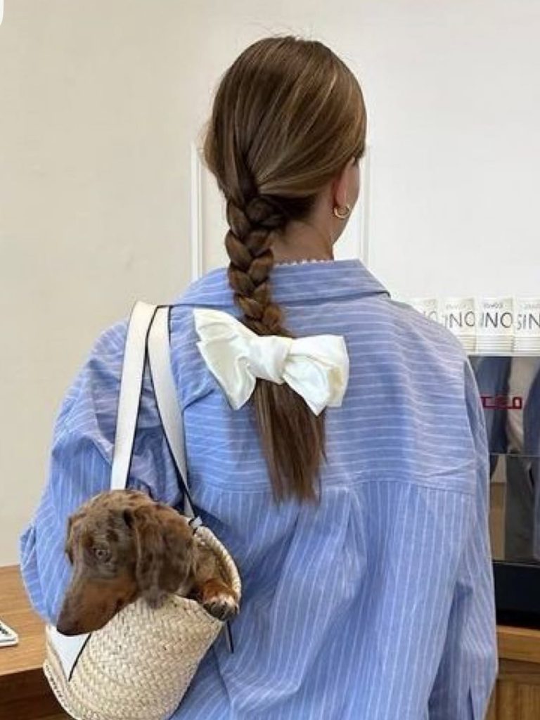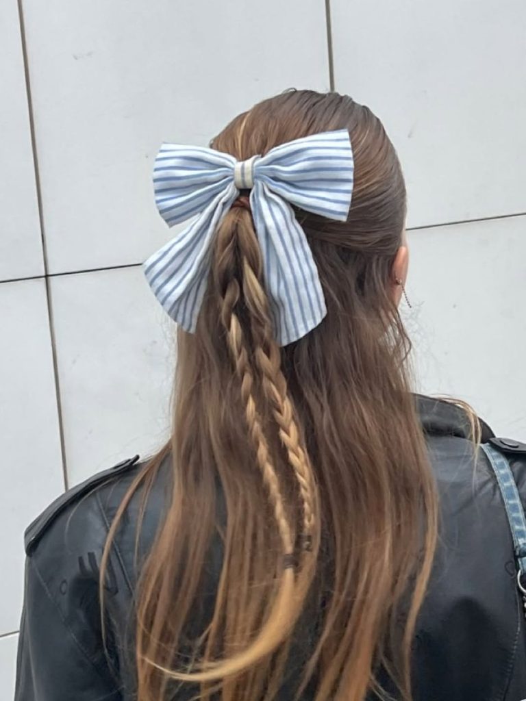 This half-up braid leans into contrast—sleek at the crown, relaxed through the lengths. The oversized bow transforms a simple braid into a deliberate style choice, making greasy roots work in your favor by adding polish at the top.