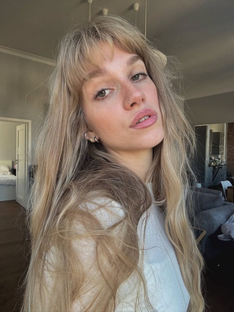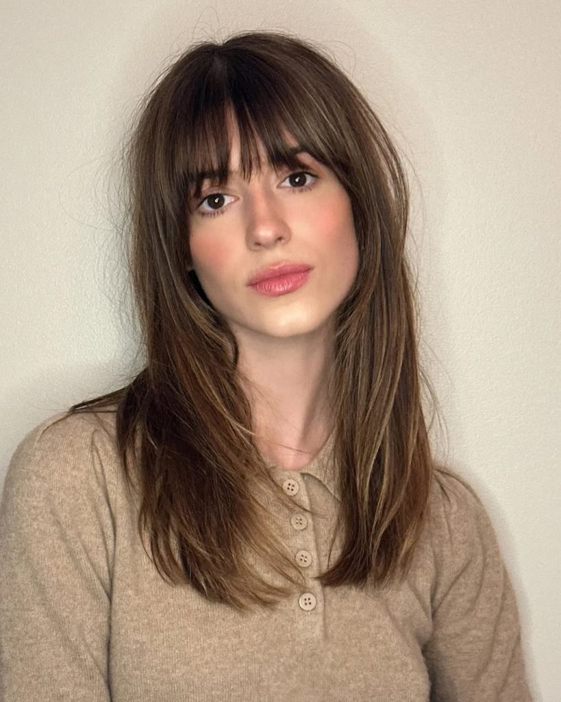 This look defines why bangs feel so current in 2026. A softly layered cut paired with a full fringe creates a balanced silhouette that feels both polished and approachable. The bangs sit just at lash level, blending seamlessly into long hair and layers, which helps elongate the face and soften sharper features.