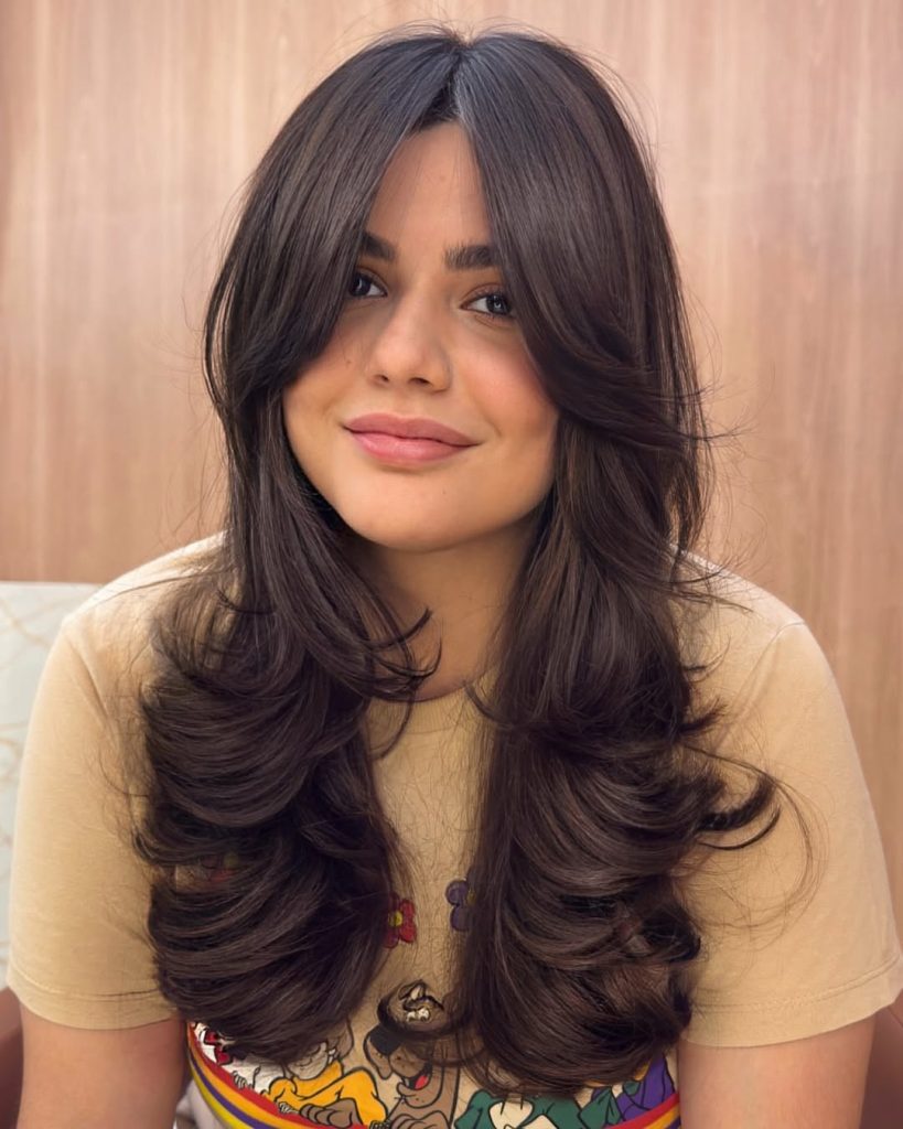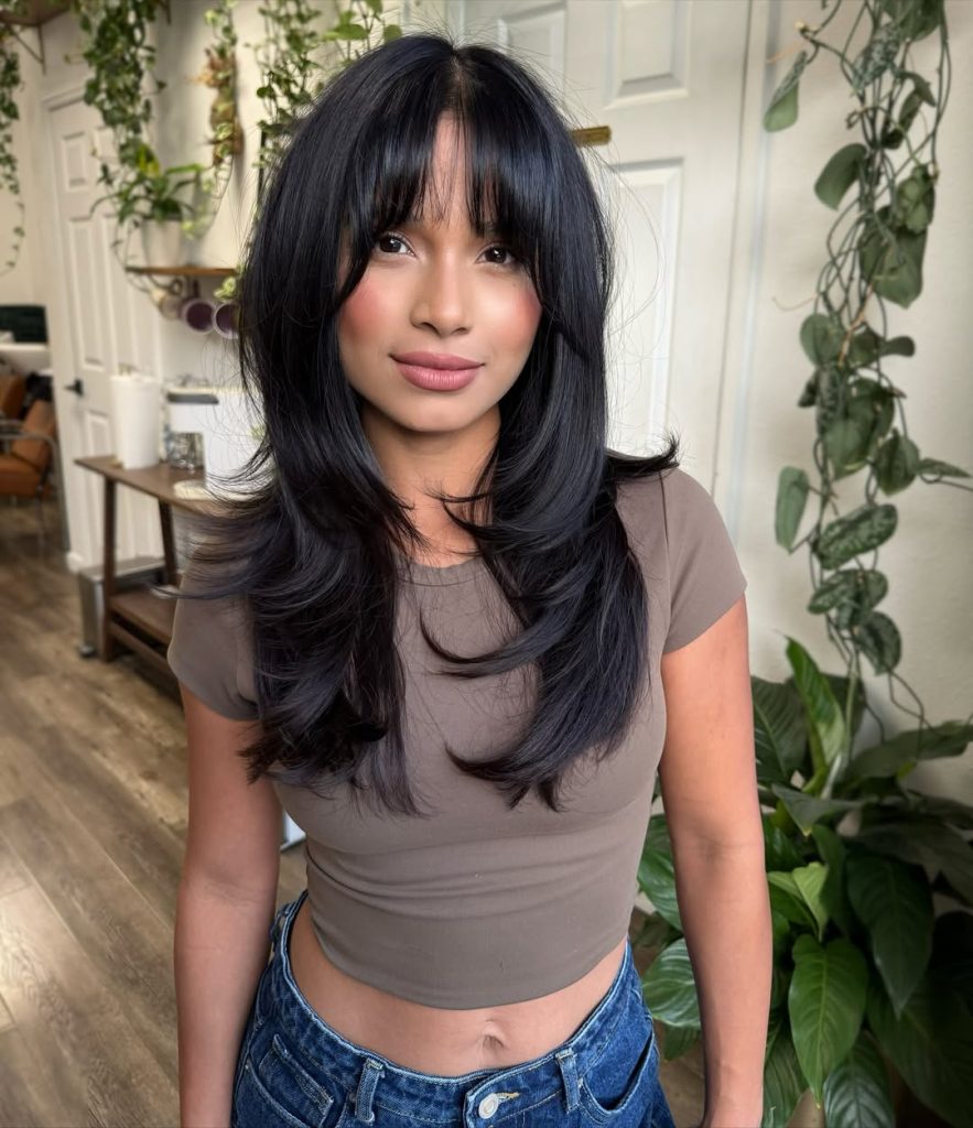 This layered cut proves that bangs can feel bold without being harsh. The center-parted fringe opens the face, while the volume through the lengths adds drama and confidence. It’s particularly flattering for women who enjoy styling and want a look that feels intentional.