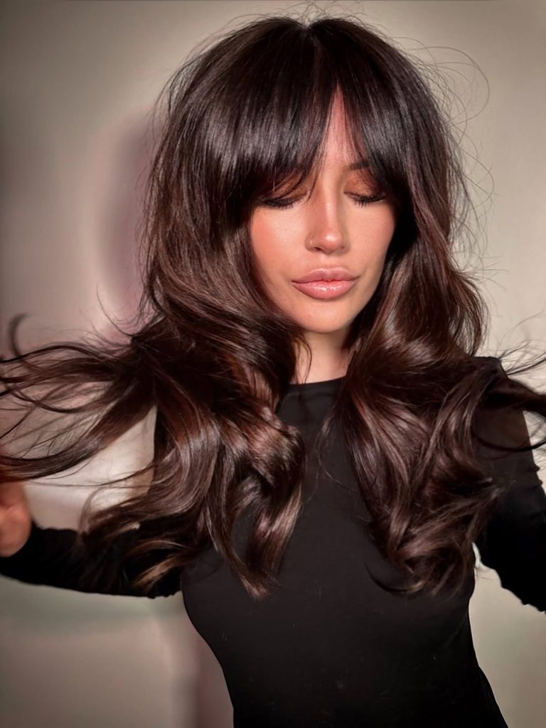 This softly waved brunette look shows how bangs can feel effortlessly wearable at any age. The fringe is light and slightly broken up, allowing it to frame the eyes without feeling heavy. Paired with loose waves through the lengths, this style flatters medium-length and long hair equally well.