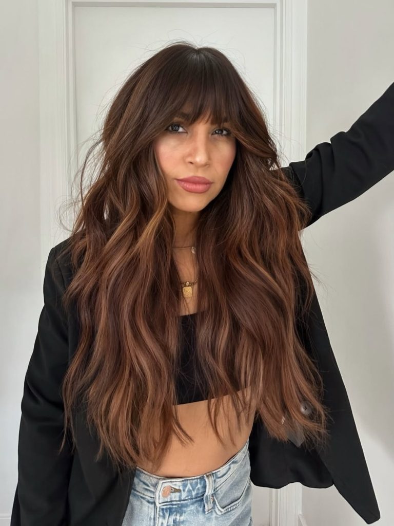 Natural-looking bangs paired with long brunette hair reflect a broader shift toward authenticity in beauty. The bangs are softly shaped, never overpowering the face, and blend effortlessly into the length.