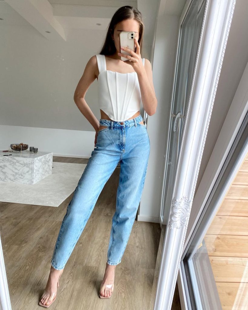 With a bright white corset top, you can mix and match light blue straight-leg jeans and tailored pants to form a polished, modern, and somewhat romantic look that is effortlessly casual.