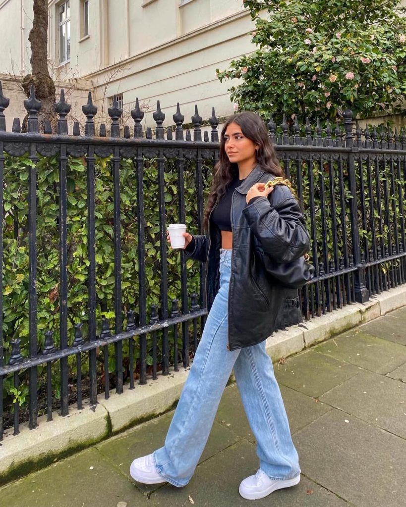 Here, a Black crop top and oversized leather jacket meet light blue wide-leg denim, creating that coffee-run-in-the-city kind of cool.