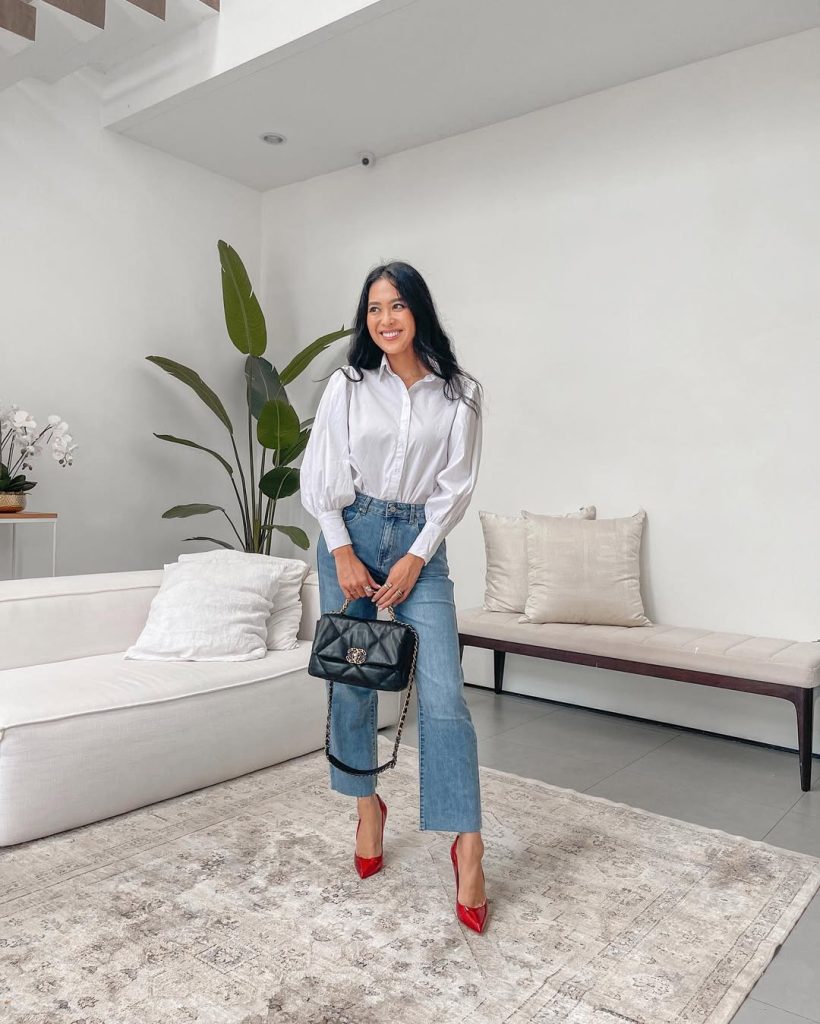 A crisp white shirt with statement sleeves, when tucked into light blue cropped straight-leg jeans, creates an uplifting ensemble that blends office style with a gallery vibe.