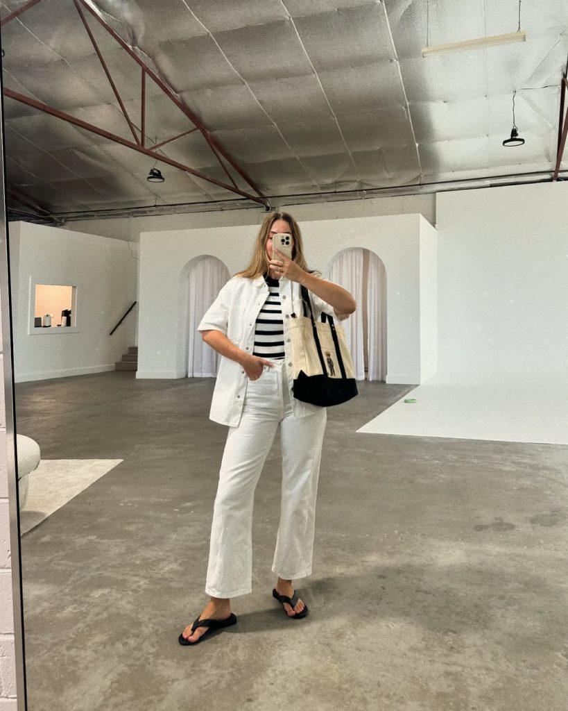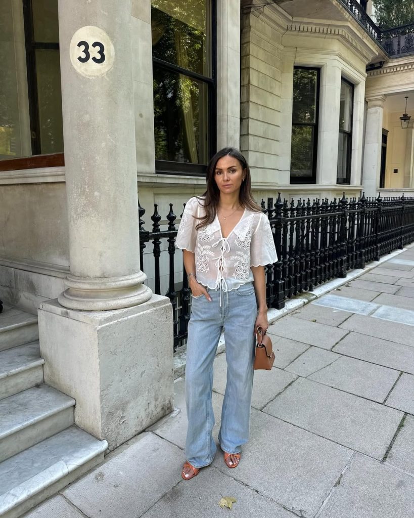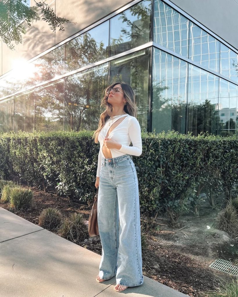 A cut-out white top paired with ultra-wide-leg light blue jeans evokes a relaxed, sunlit summer energy reminiscent of a street-style roundup.