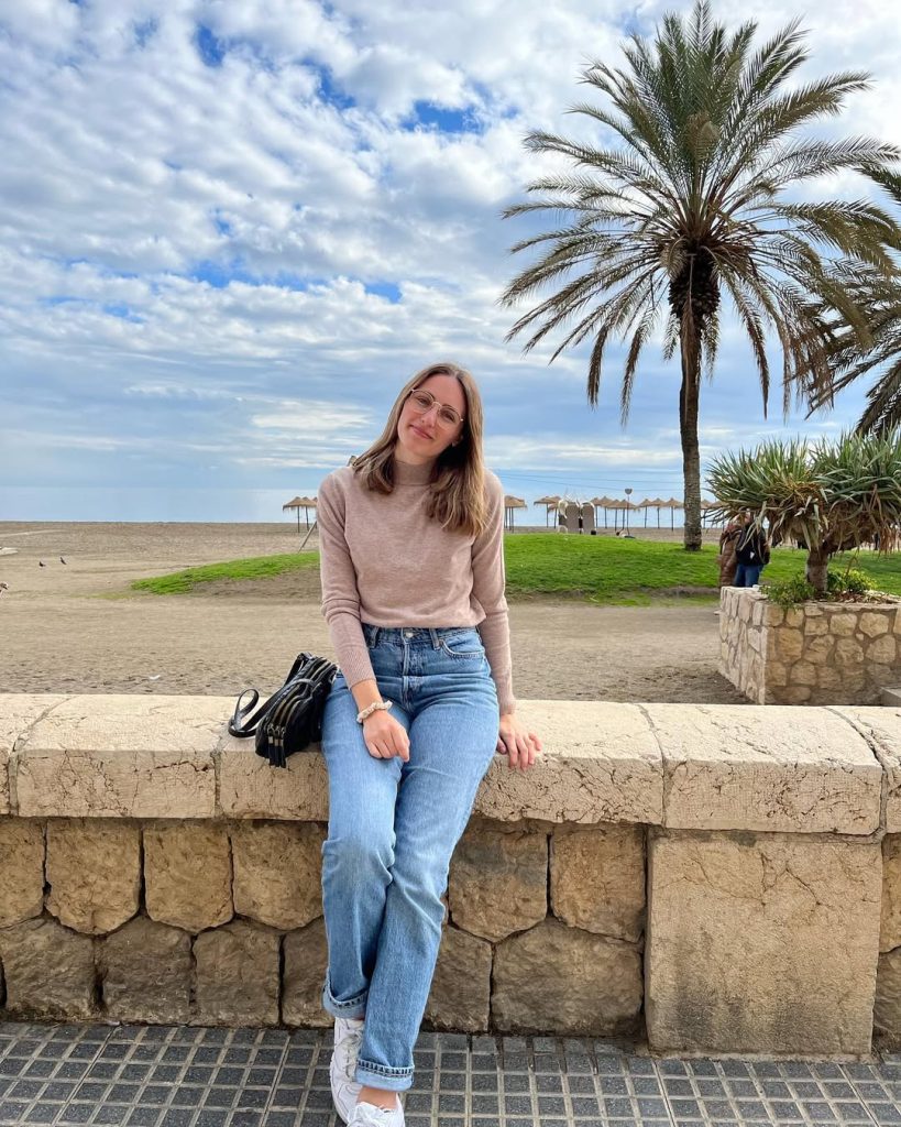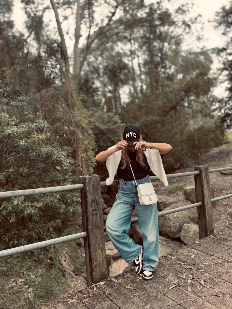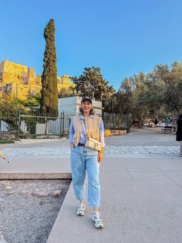 A sporty vest and relaxed light blue mom jeans create an easy travel uniform, polished enough for sightseeing snaps yet fully walkable.