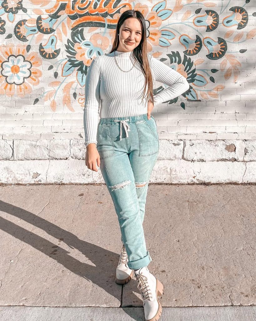 Here, a ribbed white top pairs with softly washed, jogger-style light blue jeans that lean into the relaxed barrel trend while staying polished.