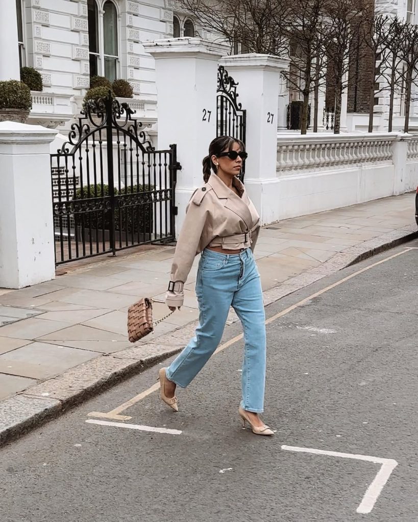 A cropped trench-style jacket and light blue straight-leg denim create a sharp, city-ready silhouette that balances structure and ease.