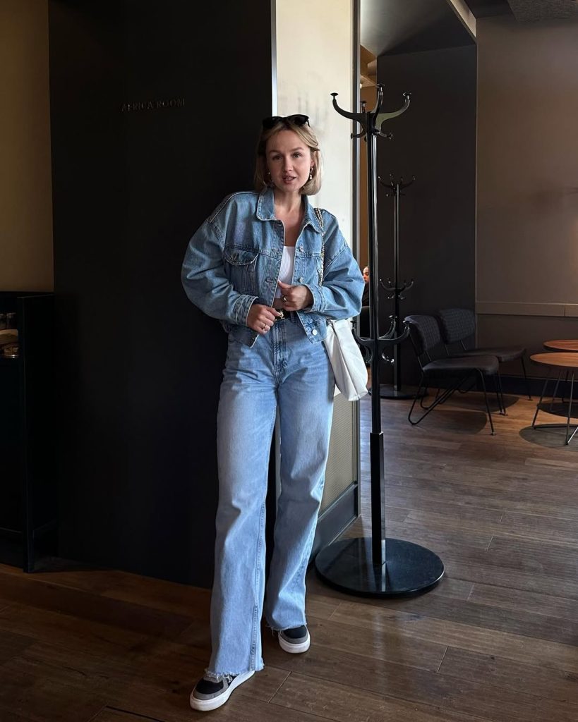 Classic double denim gets a 2026 update with a cropped jacket and light blue wide-leg jeans that feel relaxed yet intentionally styled.