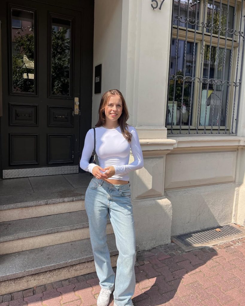 A fitted white long-sleeve top curves gently into relaxed light blue jeans, creating a streamlined, everyday uniform that feels fresh and casual.