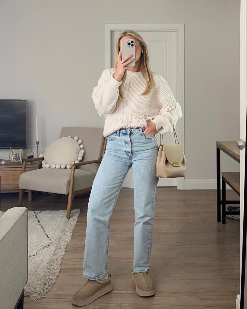 Soft neutrals meet seaside denim in this easy, feel-good look built around light blue straight-leg jeans and a cozy knit, perfect for relaxed summer days.