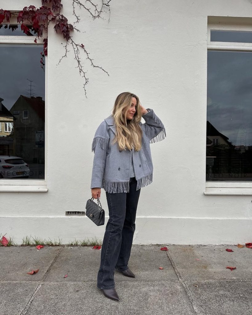 - Simple jewelry, keeping the focus on the strong jacket-and-jeans contrast