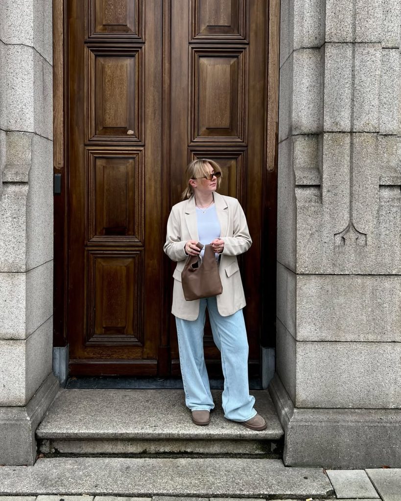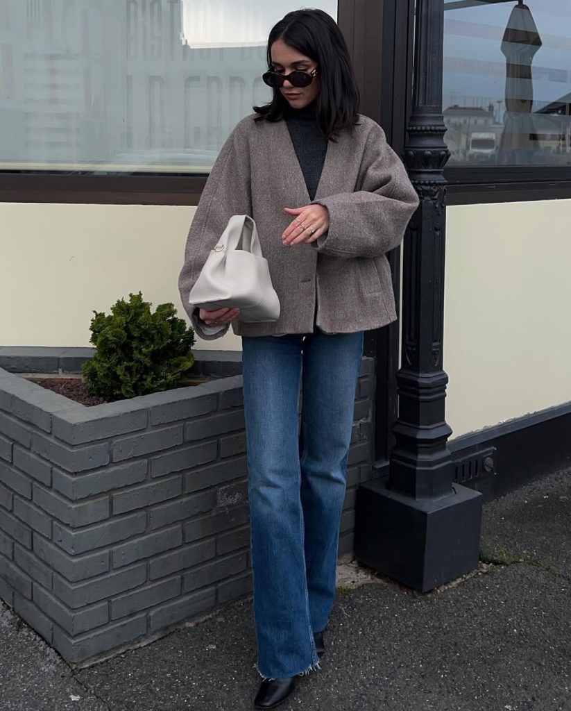 This is a look I can imagine on a Saturday—grabbing a latte, wandering through bookstores, or meeting friends for brunch. It’s wonderful for women who like a slightly baggy silhouette but still want structure on top. Add personality with tinted sunglasses or a bright scarf tucked into the bag. Skip overly dainty heels; the charm here lies in the grounded, street-style energy that feels right at home in any fall or mild winter city setting.