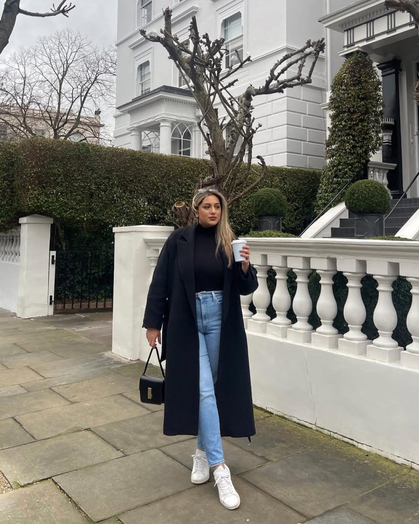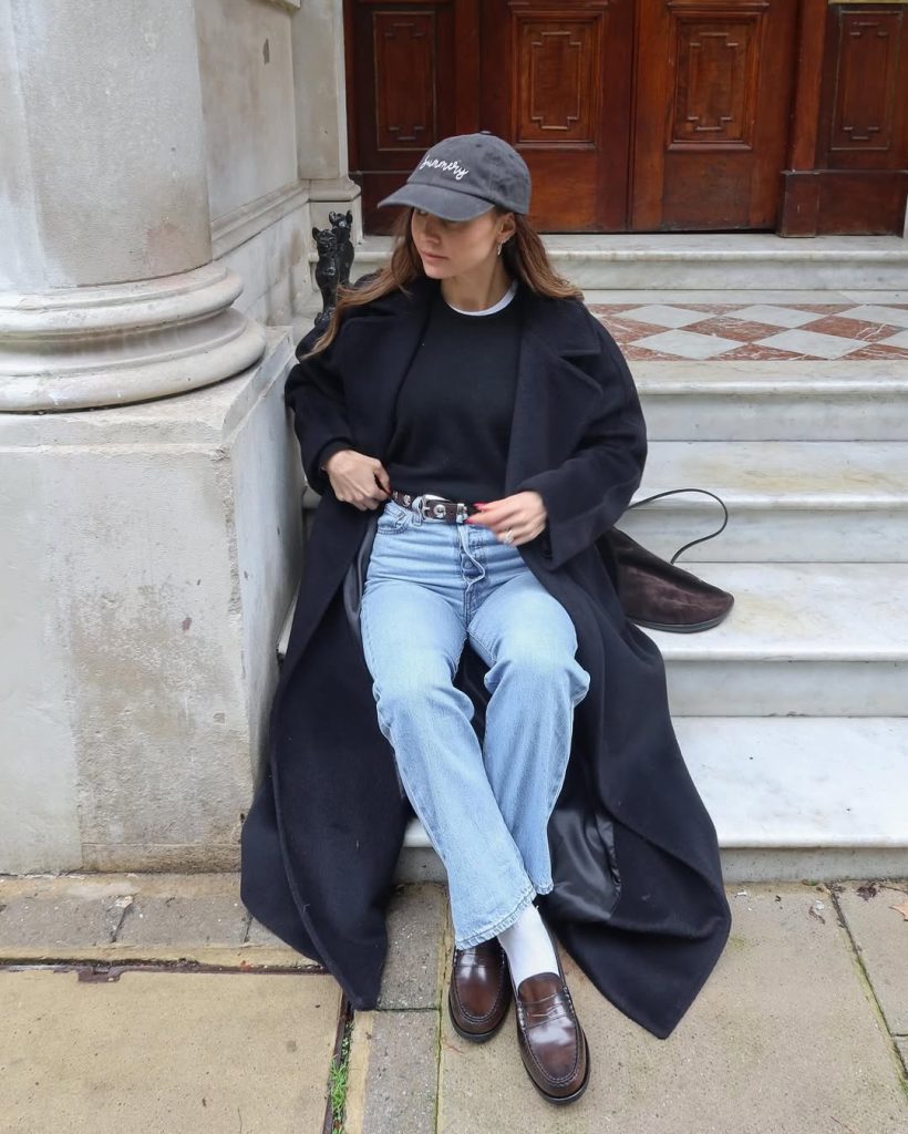 A baseball cap, long black coat, and light blue straight-leg jeans blend sporty and preppy elements into an easy, street-smart layering idea.
