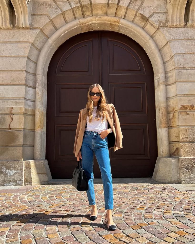 This is a go-to for office-adjacent days, gallery openings, or polished lunches for women who love subtle tailoring. Add personality with a silk scarf or red manicure; avoid oversized backpacks or loud sneakers, which could disrupt the refined, metropolitan rhythm of this 2026 denim formula.