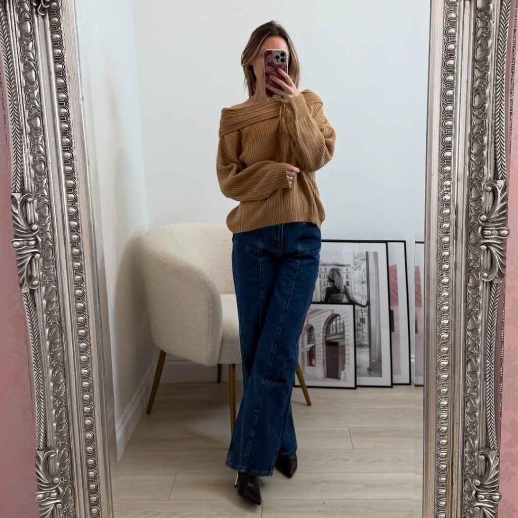 - Wide-neck ribbed sweater in warm camel Brown, worn off-shoulder