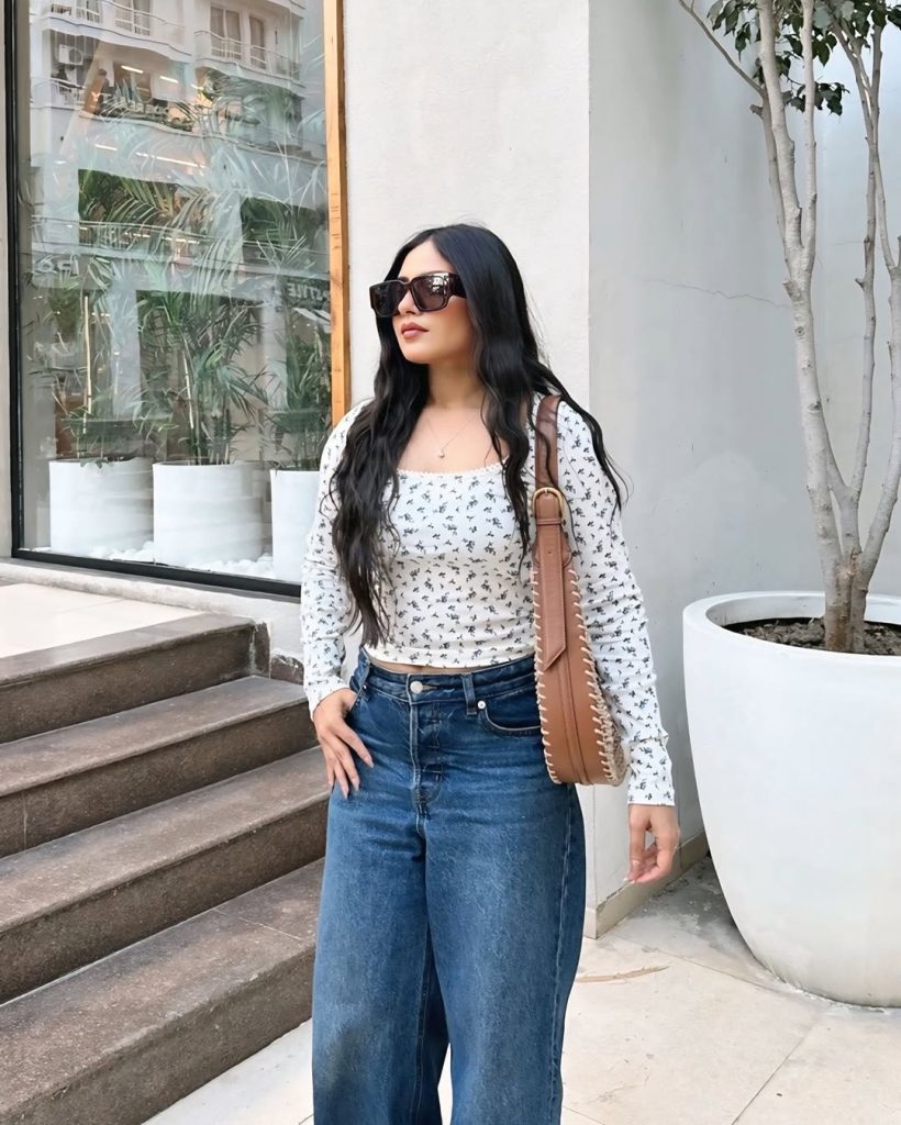 A feminine printed top contrasts with rich blue wide-leg jeans, creating a look that’s romantic yet grounded enough for everyday wear.