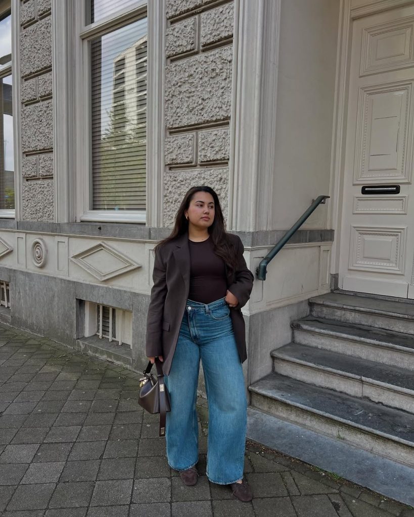 Deep chocolate tones and mid-wash wide-leg denim create a rich, editorial take on everyday blue jeans that still feels wonderfully wearable.