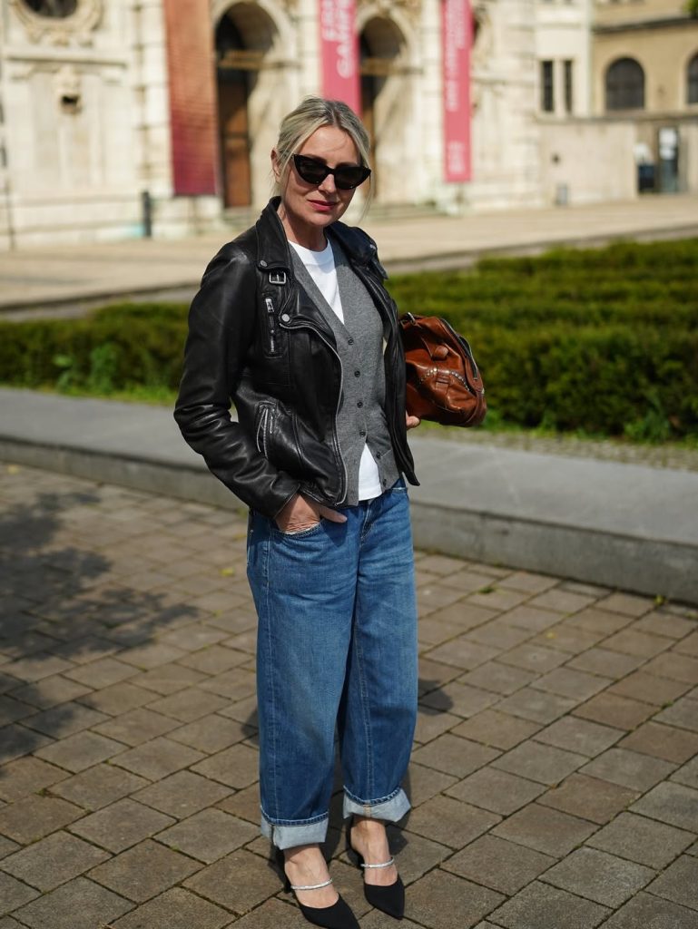A classic black leather jacket tops generous cuffed jeans, blending rock-and-roll attitude with tailored polish in a grown-up baggy silhouette.