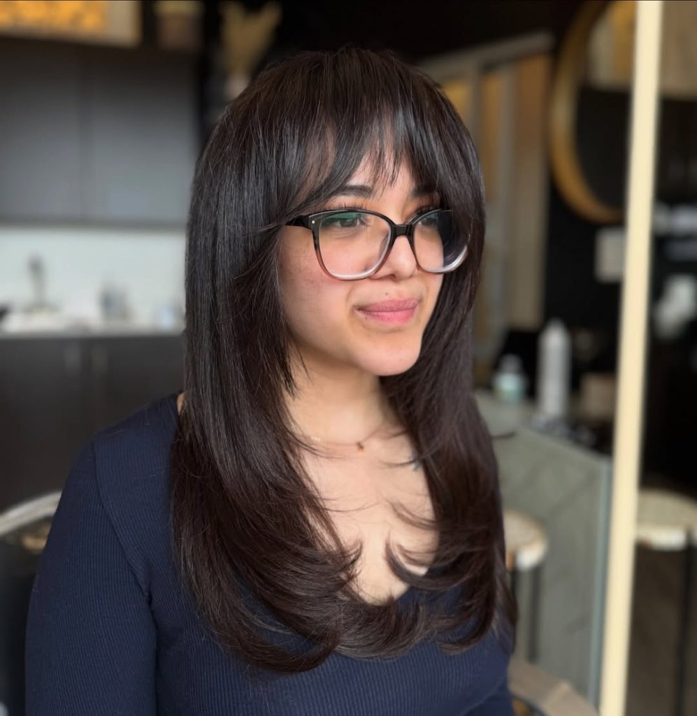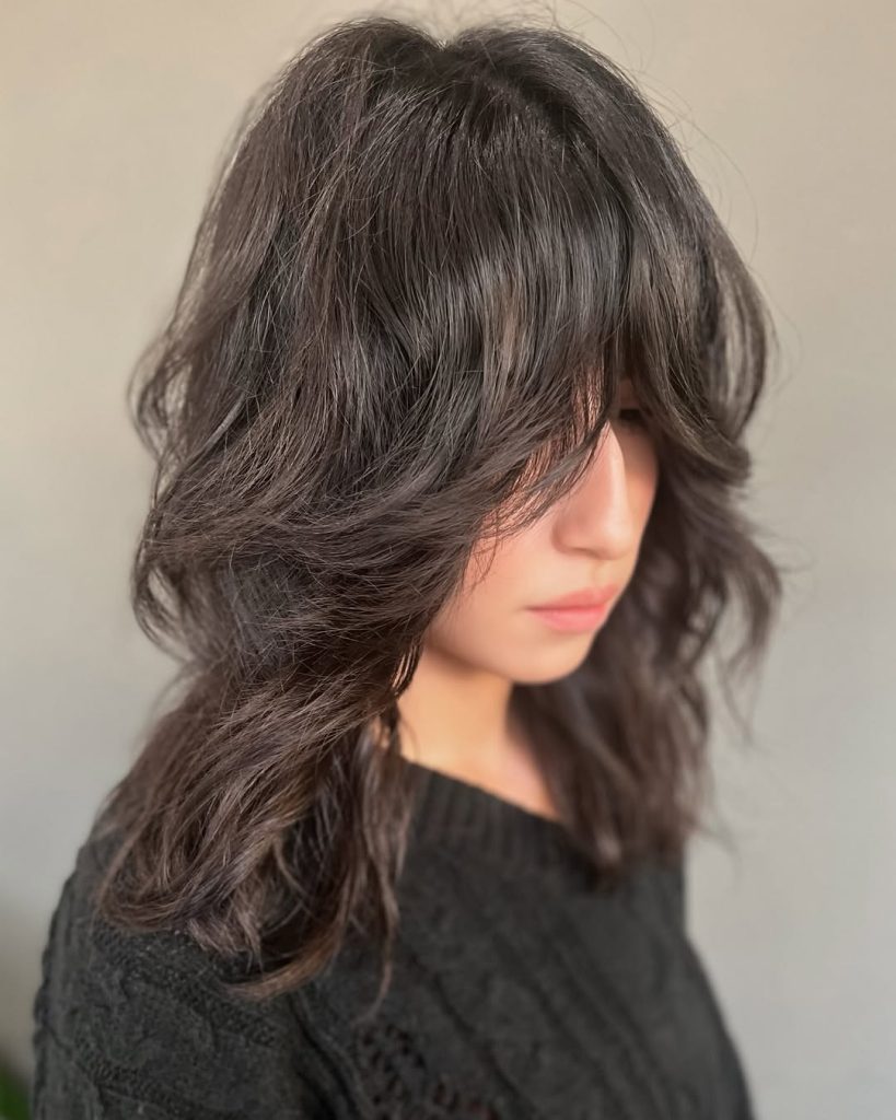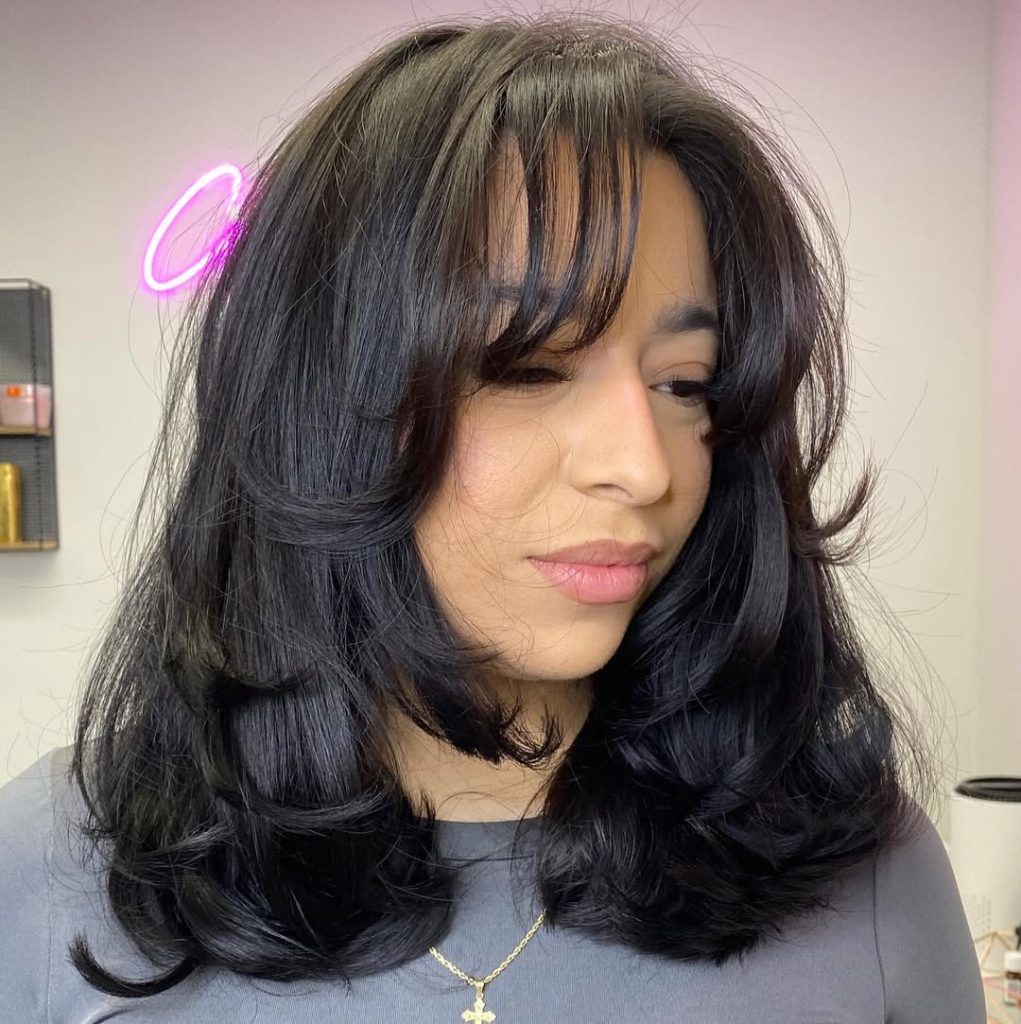 This is the most asked-for salon cut right now: a soft cascade on medium lengths with wispy, eye-skimming bangs. The long internal layering collapses bulk at the ends so hair flips and floats rather than sitting heavy. It’s ideal for women with dense, straight hair who want movement without losing thickness.