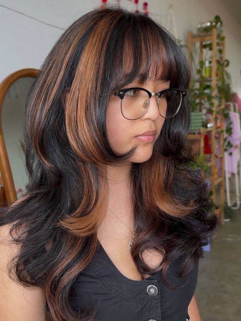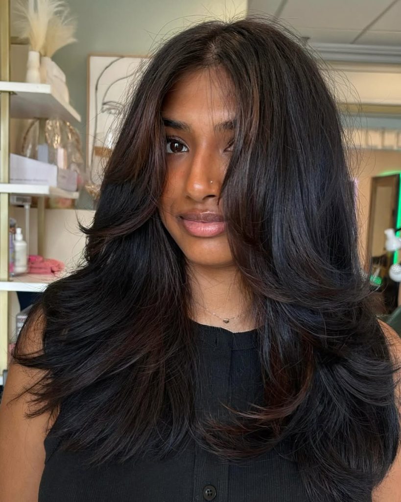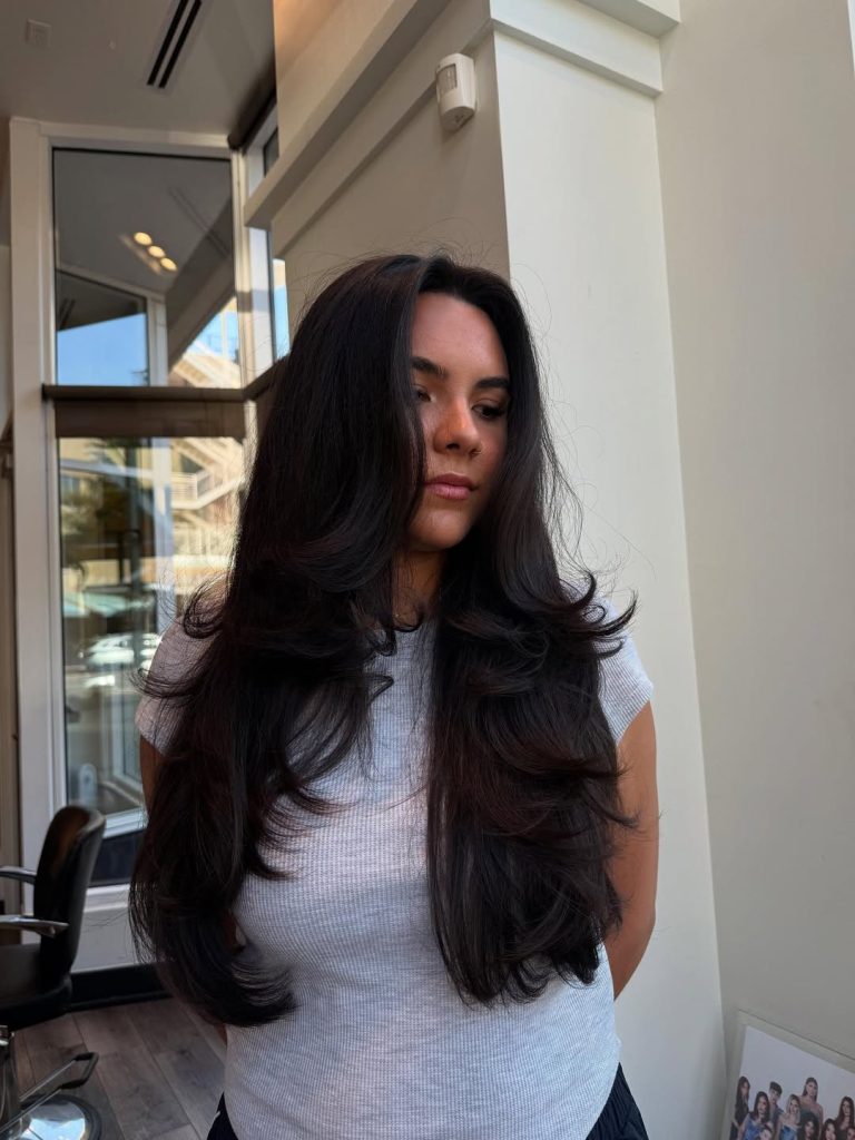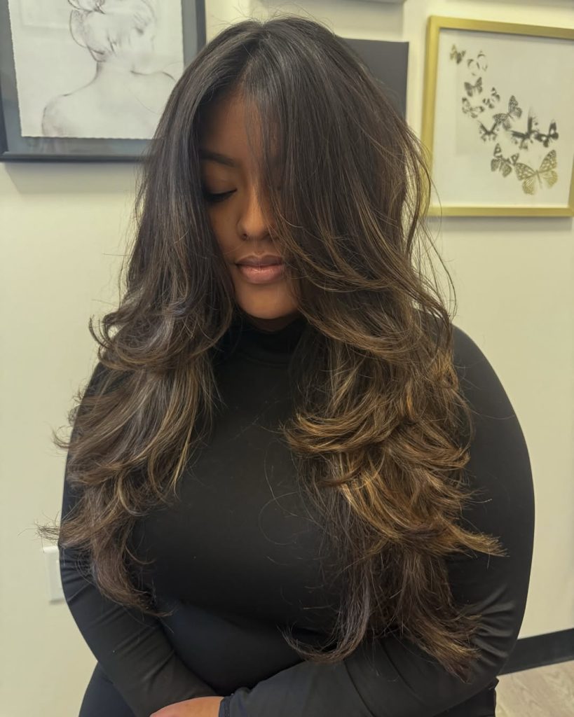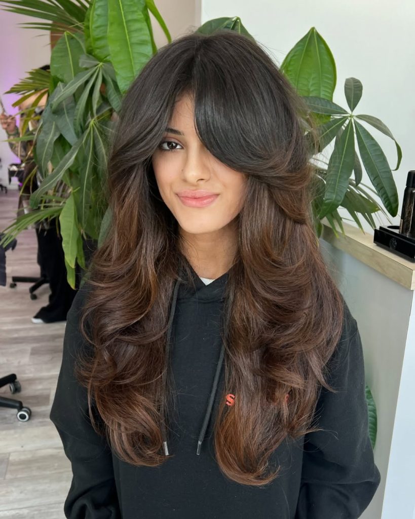 Ultra-glossy Long layers, cut to keep density yet carve swing through the ends. The face frame starts at the lips to sharpen cheekbones while staying low-maintenance for long hair. Subtle cinnamon ribbons brighten the movement without reading as high contrast. This silhouette is editor-approved for 2026 because it’s office-friendly by day and glam with a single pass of a hot brush by night. For the most lifted finish, dry the crown forward first, then flip back—an old-school trick from blowout bars that still works. Universally flattering on oval faces; creates length for round faces with its vertical part and long, soft fringe.