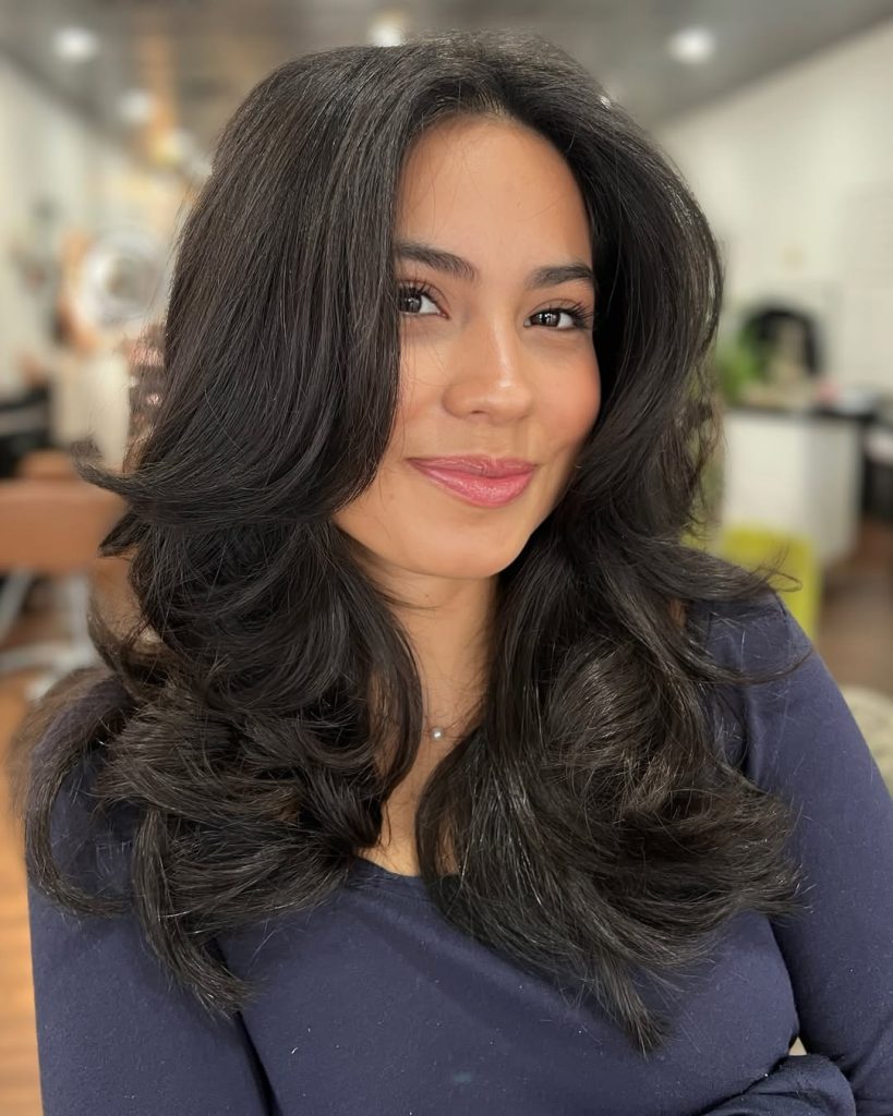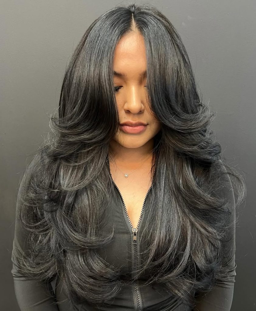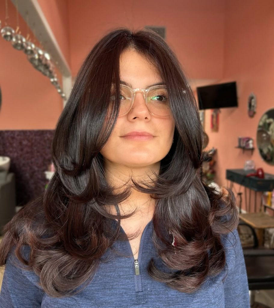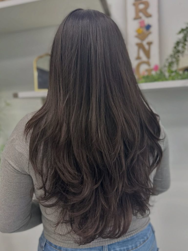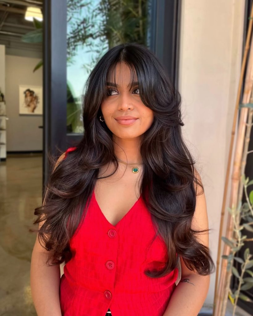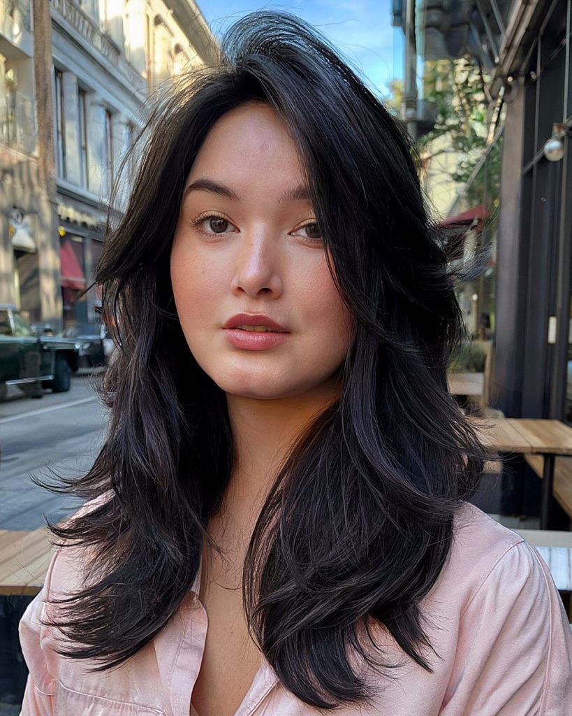 Here we’re seeing Long hair with big, graduated layers and with curtain bangs—a cut I’d file under “LA-meets-Korean salon” because the blowout gives cloud-like volume through the mid-lengths. Rich brunette with soft dimension keeps it luxe, not bulky.