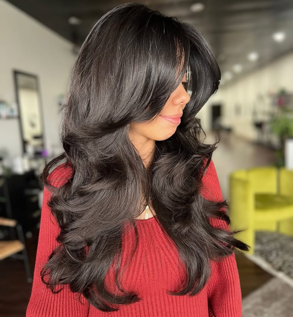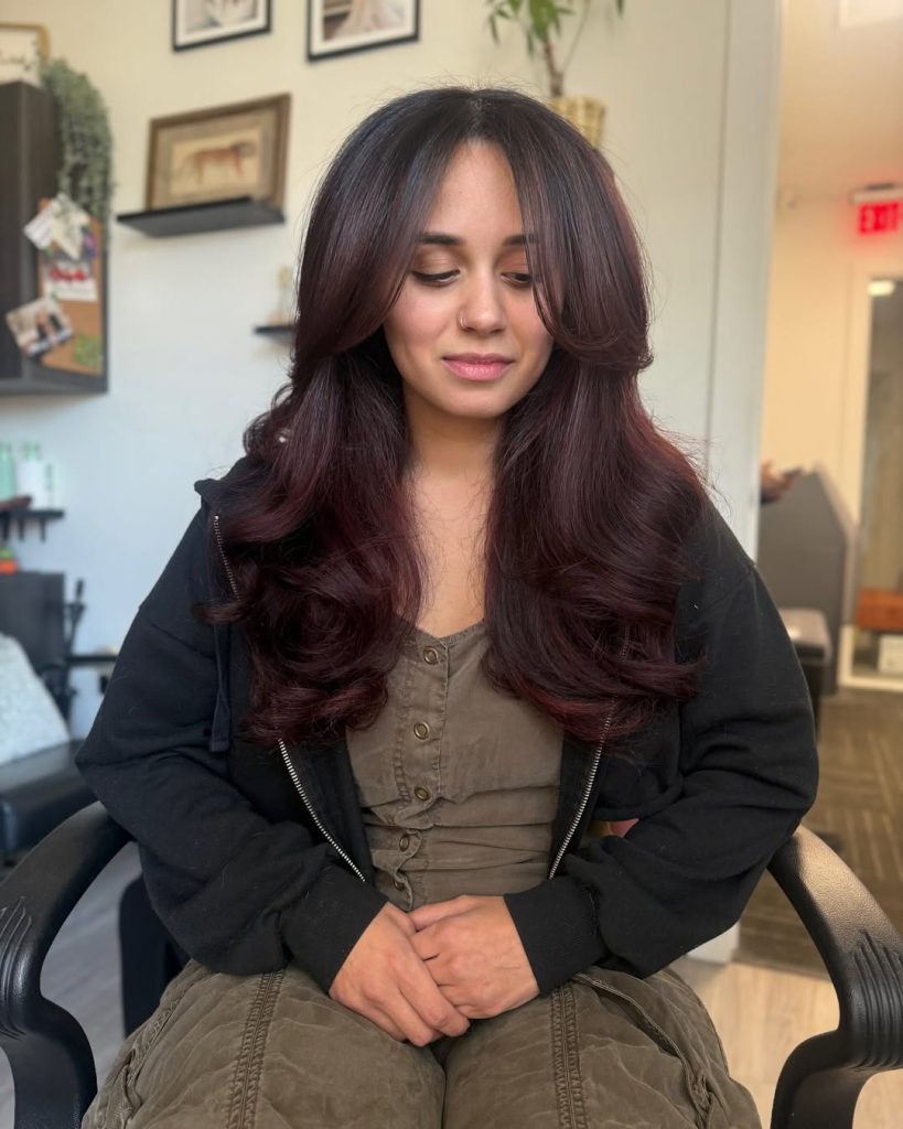 A sultry, wine-toned take on layered long hair: plush volume at the mid-lengths, beveled ends, and a graduated face frame with curtain bangs that sits perfectly at the temples. The color depth makes the layers pop even in low light—a smart choice for women who want statement hair without daily heat. To style, use a lightweight cream for slip, then set two or three front sections in Velcro rollers for 10 minutes while you get dressed. It’s sophisticated on oval shapes and softly narrowing for round faces.