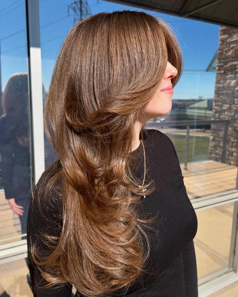 Warm toffee tones plus airy layering equals a soft-focus halo. This reads a bit French thanks to the effortless bevel and barely-there curtain shaping for long hair. The color placement keeps the ends luminous so the layers show even in low light.