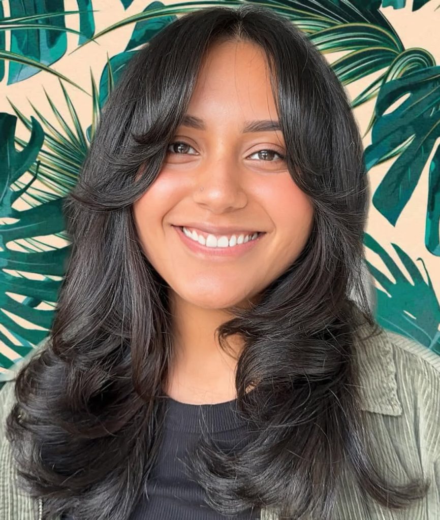 A center part and elongated face frame with curtain bangs deliver that “cloud” volume everyone’s saving this year. The layering is long and discreet—long, soft movement without sacrificing length. Beautiful on medium-to-thick Straight hair: the vertical center line subtly narrows for round faces while enhancing oval symmetry.