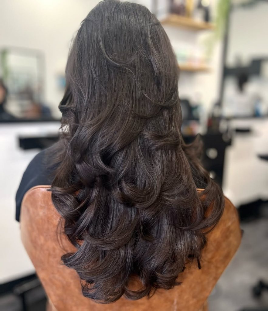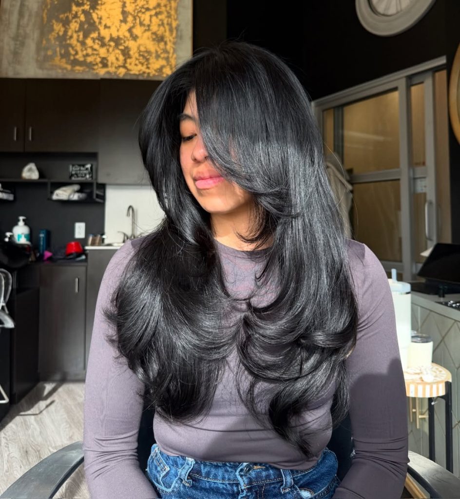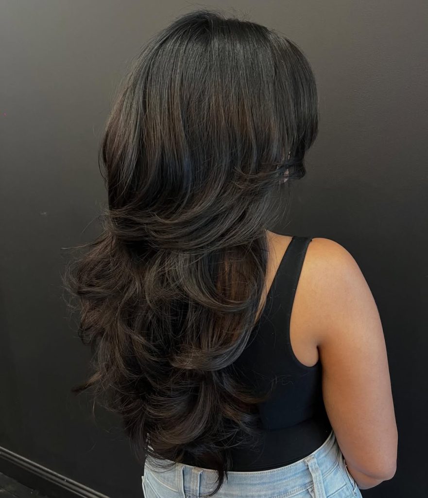 Maximum glamour on long lengths: graduated layers create stacked S-curves and a breezy face frame with curtain bangs. The dense, glossy texture reads luxe and leans slightly 90s—but the cut is modern thanks to invisible internal debulking (no visible shelves). It’s a go-to for long hair that wants to swing without losing thickness.