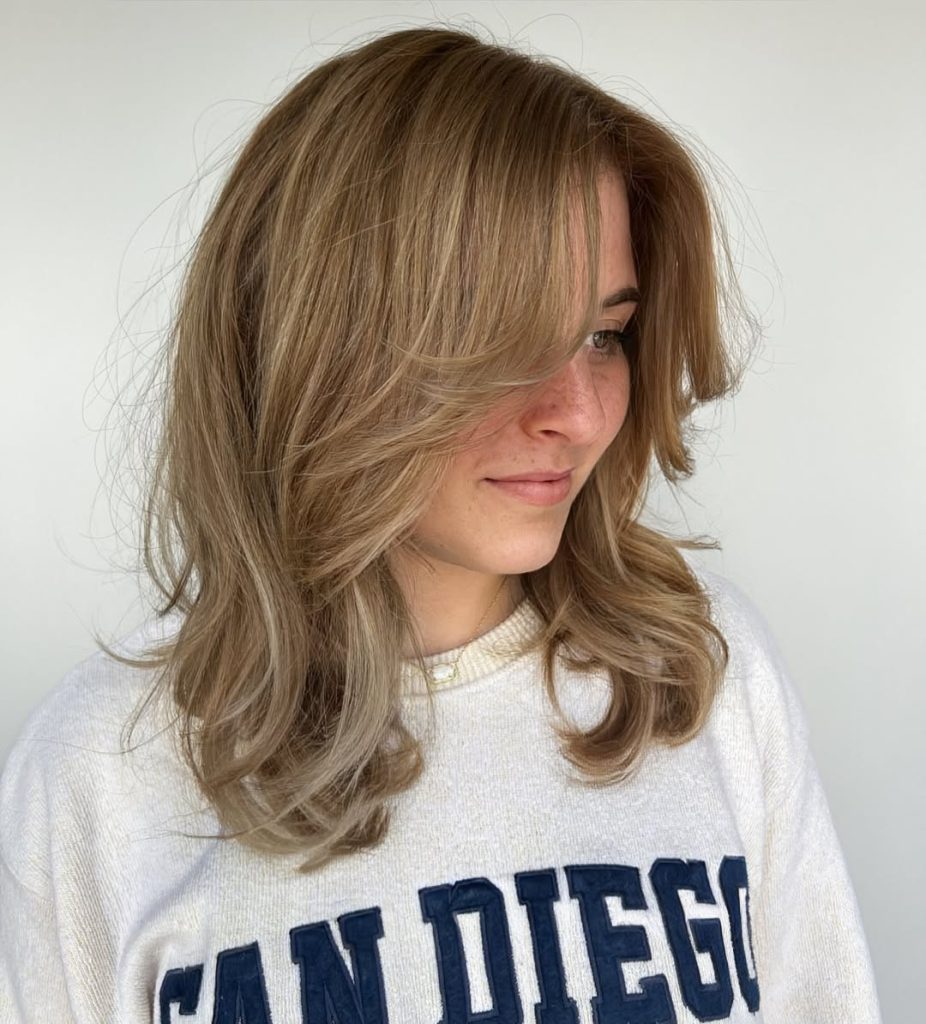 Vanilla-Toffee Medium Layers with Side-Swept Fringe