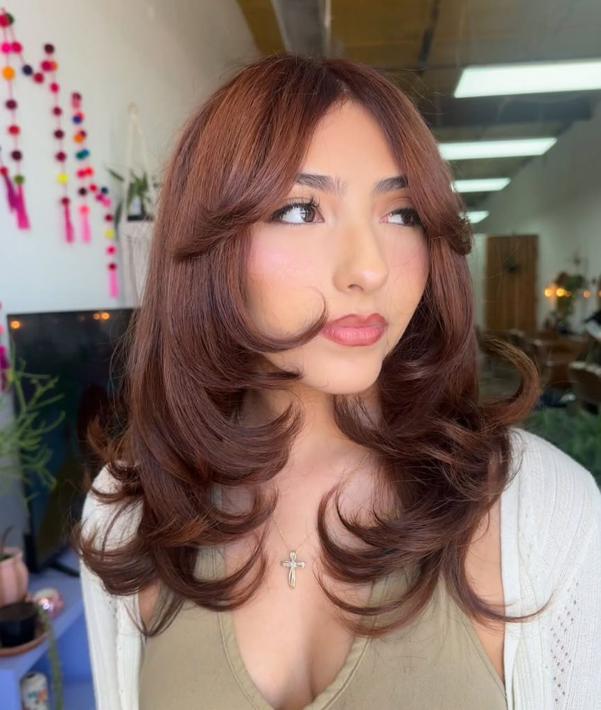 A warm cinnamon tone highlights every bend of this flirty, flippy cut on medium length. The sculpted face frame with curtain bangs sits at the temples and chin to contour the cheeks—think effortless French polish with salon bounce. Ideal for women who want definition without heavy styling. Use a lightweight cream on damp hair, round-brush just the front and the last two inches, and finish with a touch of flexible spray for all-day swing.