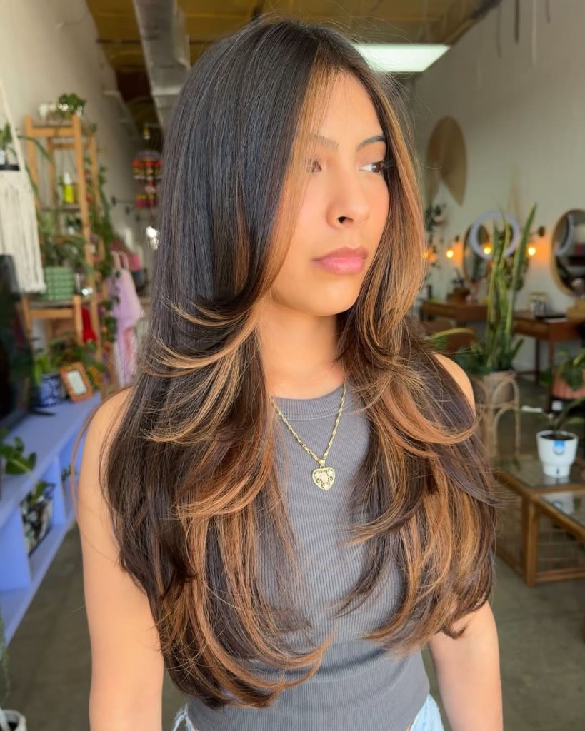 A glamorous take on long layering: a fluid face-framing cut from lip to collarbone and bevelled ends that flick away to show off caramel ribboning. The center part and elongated face frame read modern with curtain bangs—soft enough to open the eyes and long enough to tuck. Ideal for women with dense, straight hair who want movement without losing thickness for long hair. Ask your stylist for internal debulking (not surface slicing) so the finish stays soft, not choppy.
