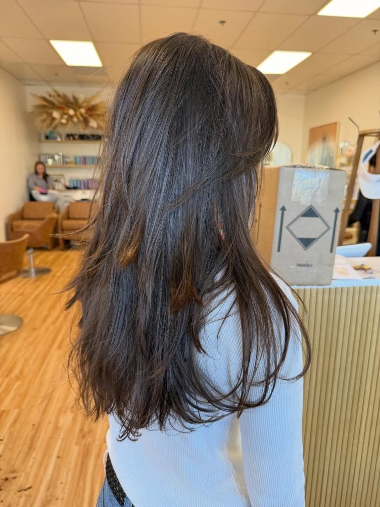 Long, fluid layering with a veil-like bang that grazes the lashes—think minimalist Korean salon influence. The interior is lightened just enough to give a “cloud” effect while keeping the perimeter solid for long hair. A great option for naturally straight hair that struggles to hold a curl; this cut builds in motion, so a quick pass with a 2″ iron on the ends will do. Product should be kept minimal around the front so it stays soft and floaty. Suitable for oval facial shapes and balances round faces thanks to the cheekbone-skimming face frame.