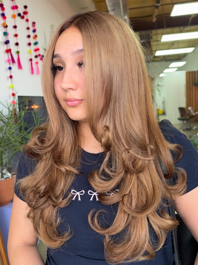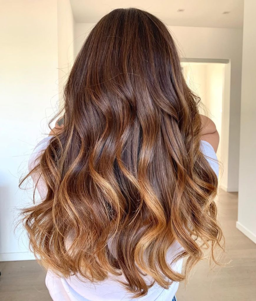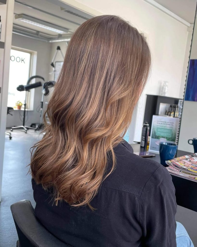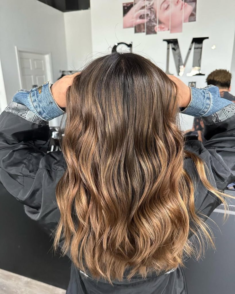 This look is a poster child for soft, wearable balayage on a light brown base. Wide, hand-painted ribbons melt from mid-length to ends into toffee and highlight caramel—the kind of glow that hints at weekends in Santa Barbara even if you’re desk-bound. The finish is long, wavy, and intentionally tousled, giving that effortless “I woke up like this” aesthetic.