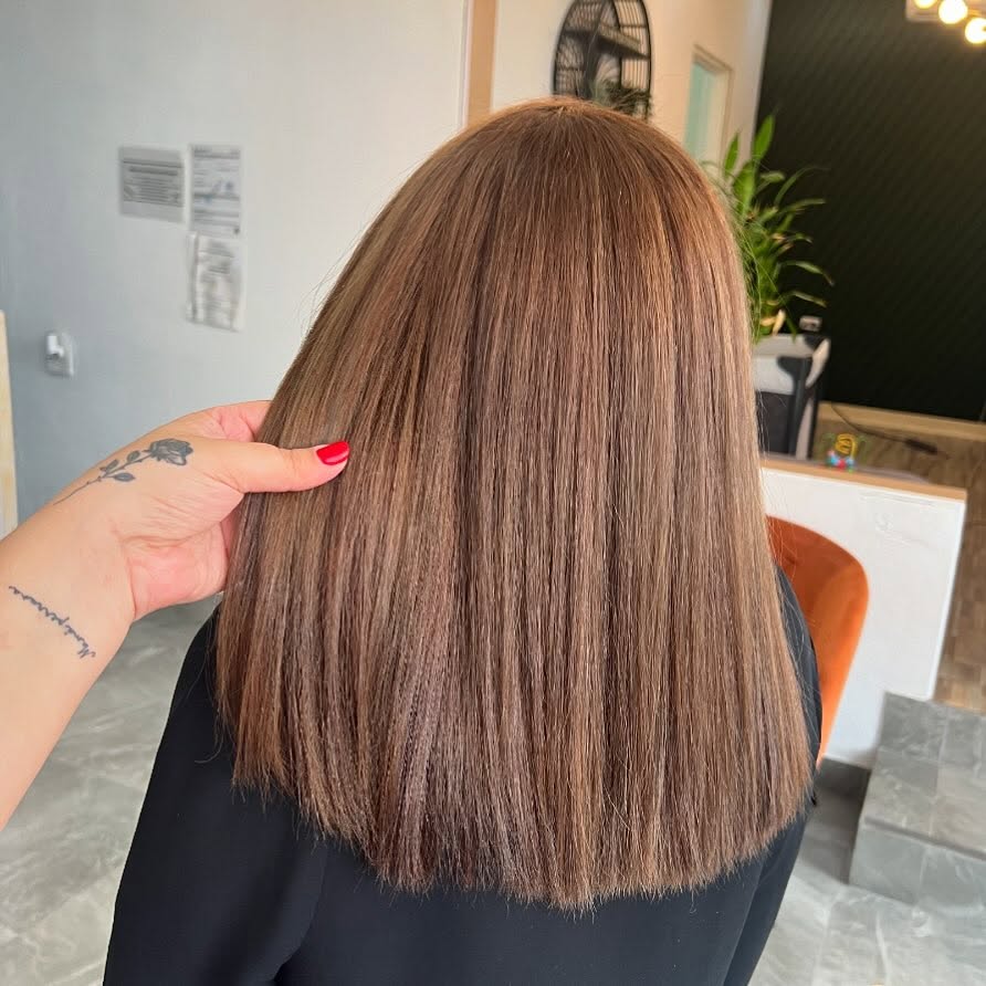 A crisp, one-length lob in latte brown—cool-neutral and impossibly shiny. This is the easiest pathway into light brown for anyone craving a clean slate.