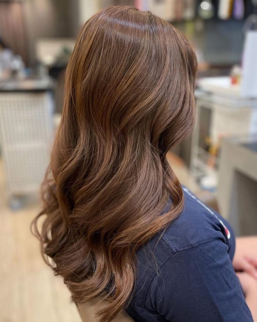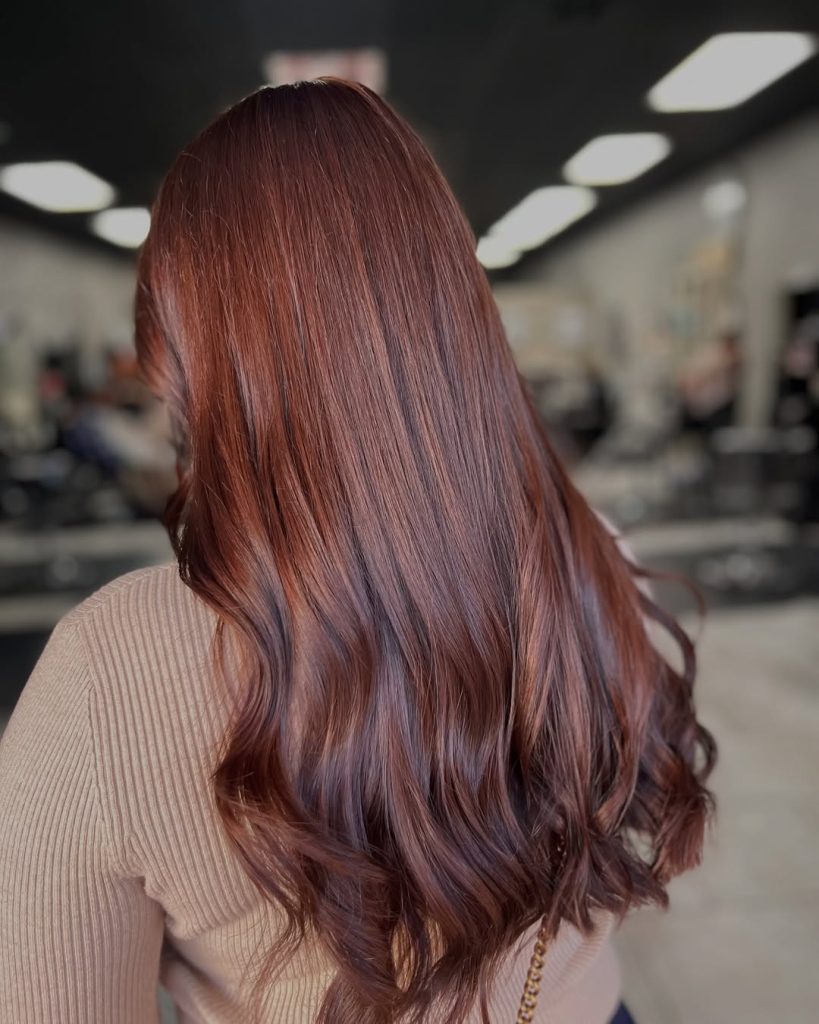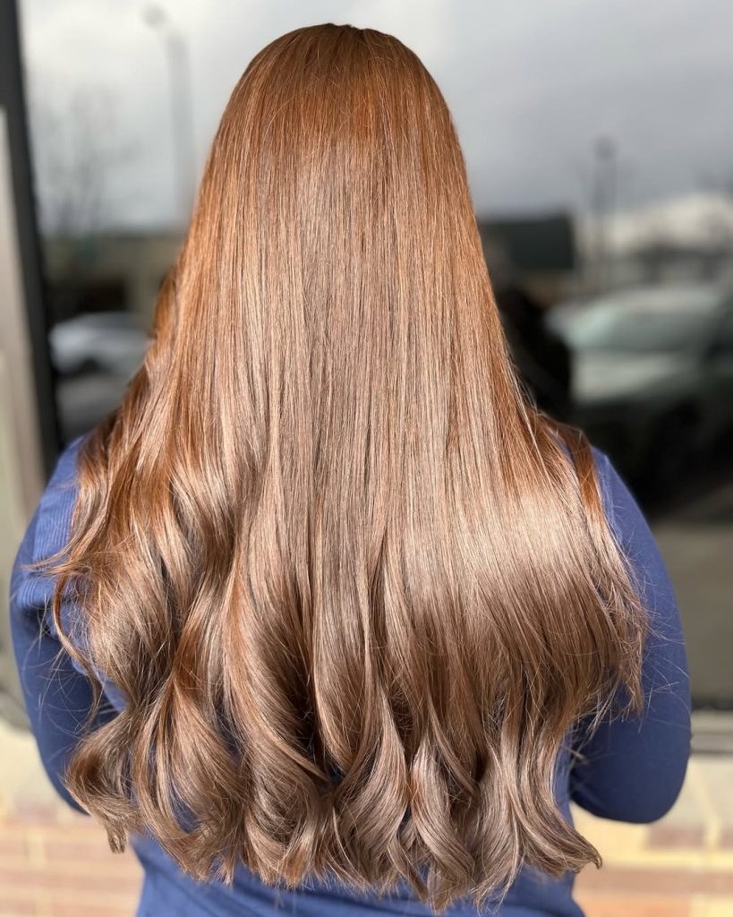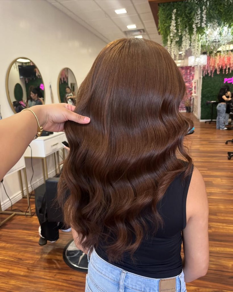For those flirting with copper but not ready to commit, this cinnamon-rose take keeps the base light brown and layers a warm gloss for a subtle red cast. The finish is silky with a loose bend—perfect for anyone exploring new color ideas without abandoning their brunette identity.