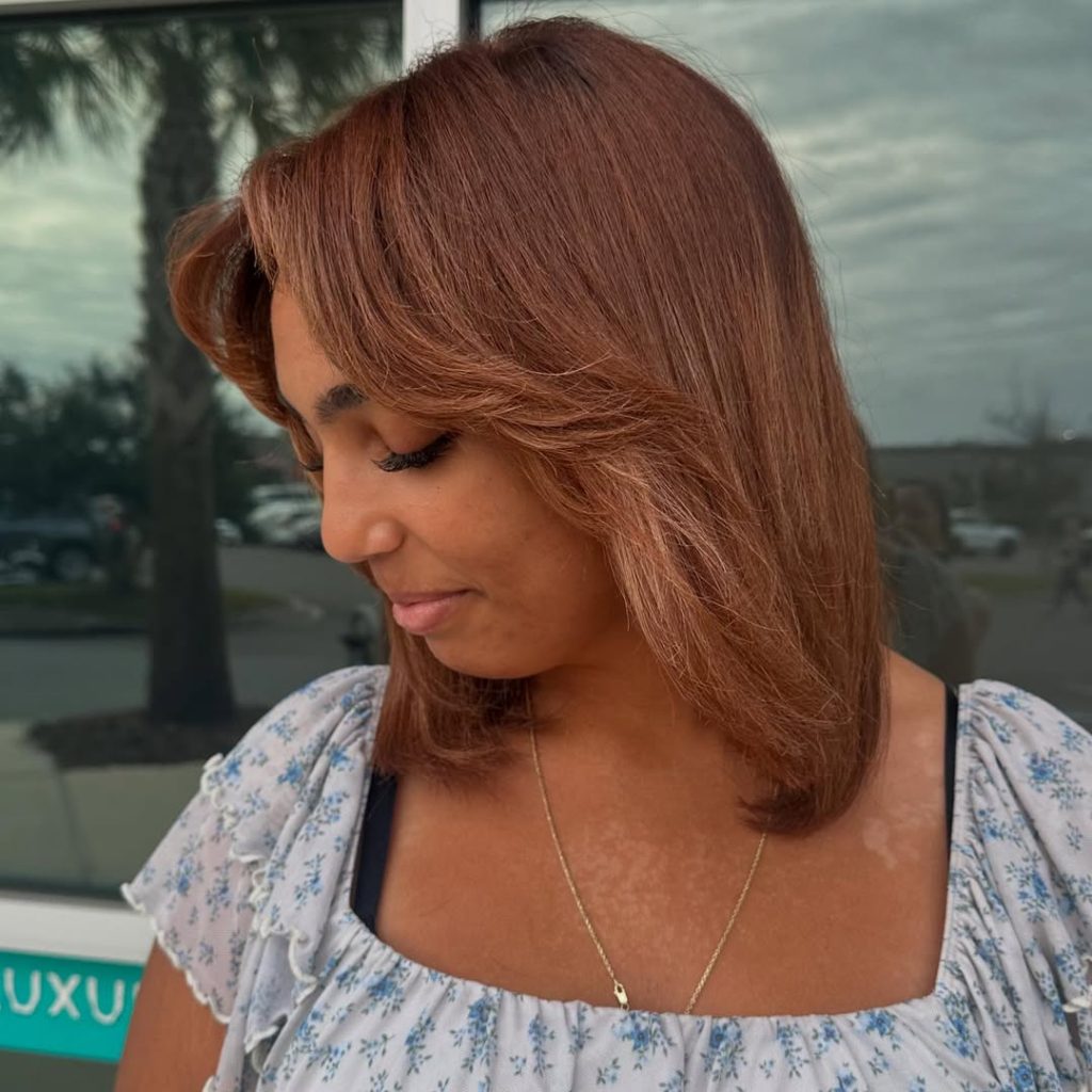 A light brown base kissed with soft copper warmth and framed by long, airy bangs. It’s boardroom-appropriate but carries a playful gleam under evening lights.