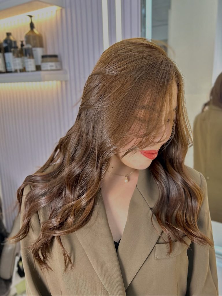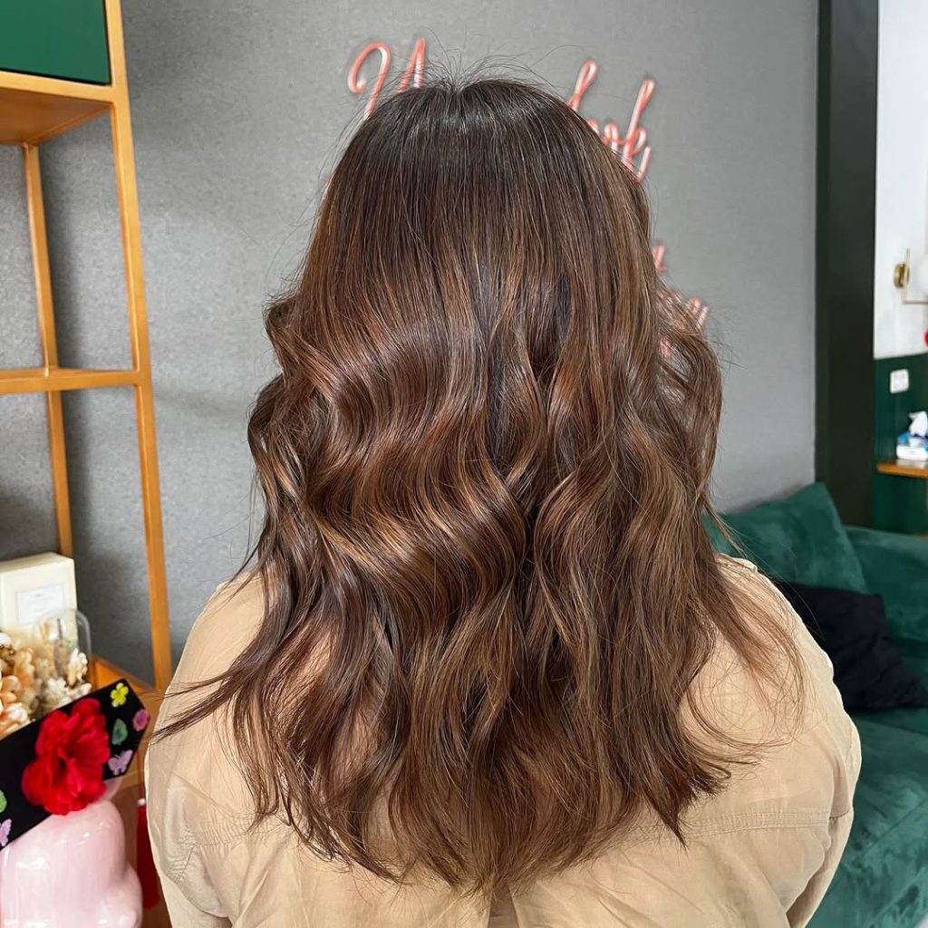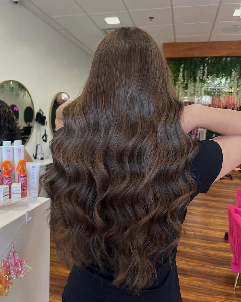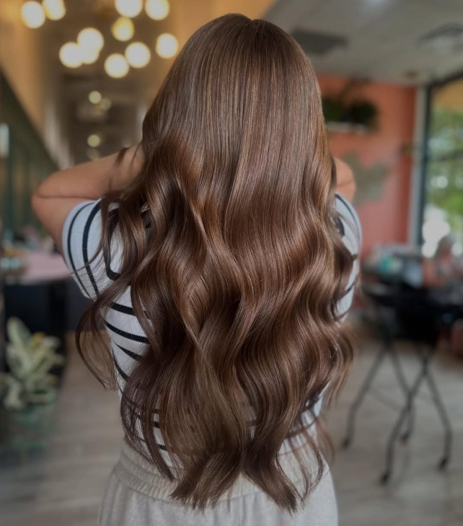 Luxurious, waist-grazing waves in a cocoa light brown that gleams like silk. The color story is intentionally subtle—fine ribbon Highlights are placed with highlights by hair pattern so the brightness lands on the outer bends of each wave. It reads very natural but undeniably polished.