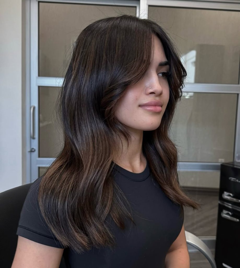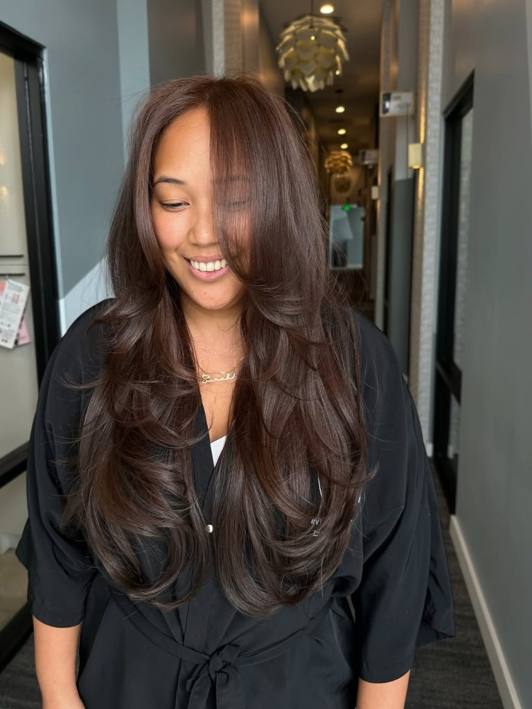 An “expensive brunette” moment: deep espresso roots diffusing into maple at the mids with a whisper of face-framing brightness. The layers and curtain fringe keep the front light and swingy.