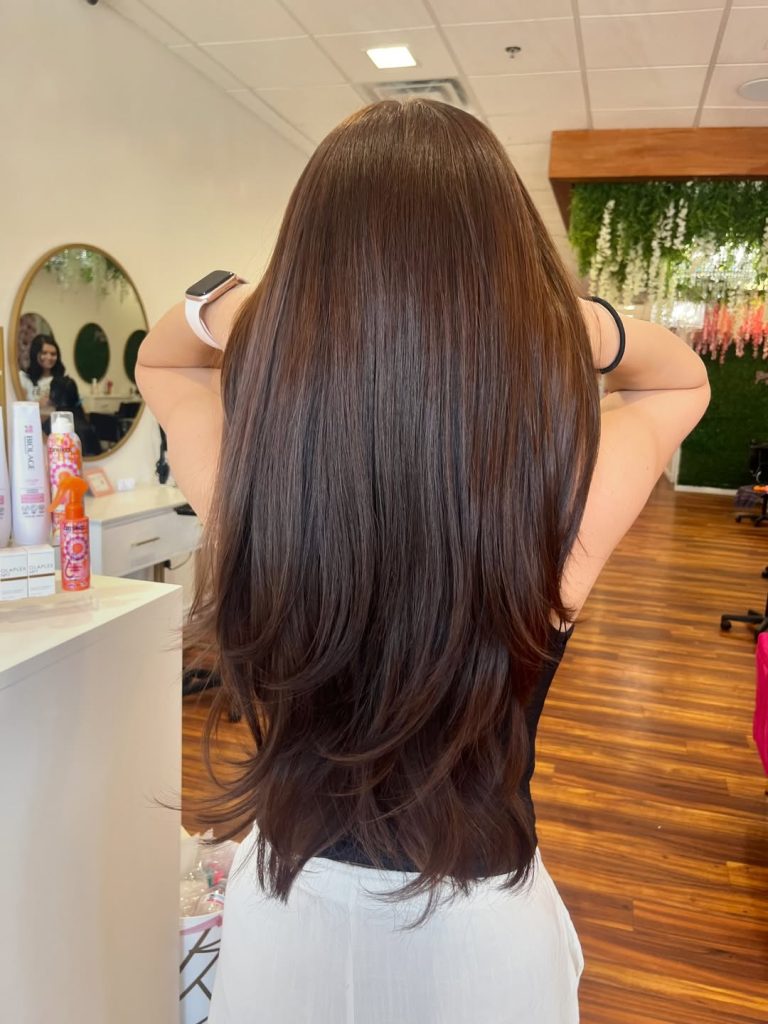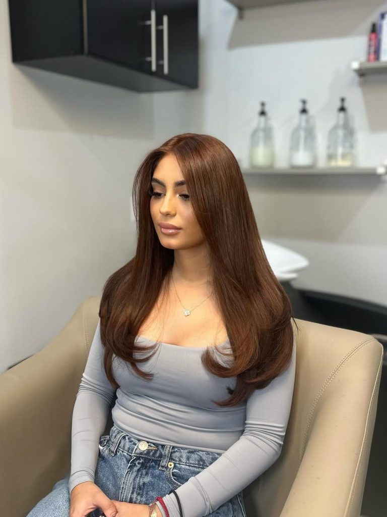 Ultra-long, layered light brown with a hint of espresso at the roots and latte mids—so shiny it reflects the room. The styling skews Straight with a light flip at the ends for movement.