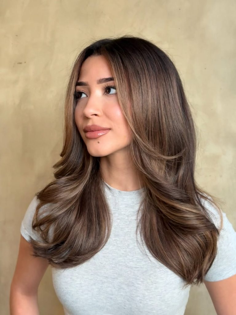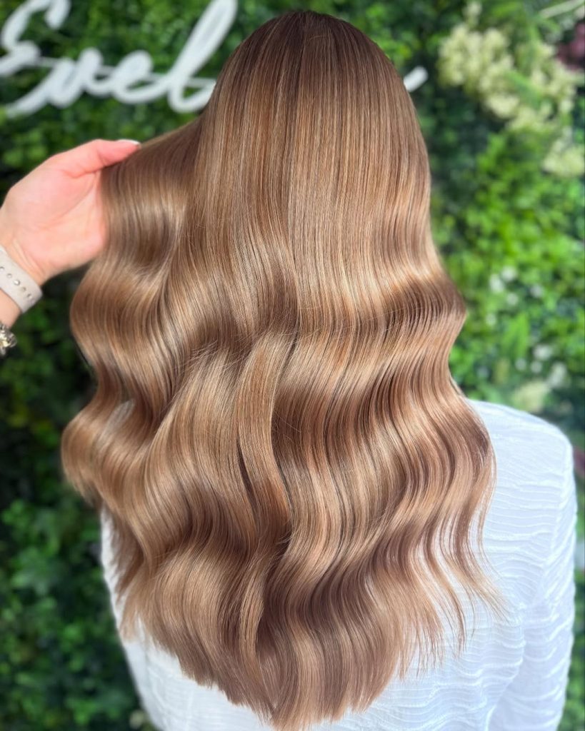 Here, a neutral light-brown base is rooted slightly deeper for dimension and then feathered with soft-focus balayage and delicate lowlights for shadow play. The result: weightless, swingy waves that look fuller without stacking layers.