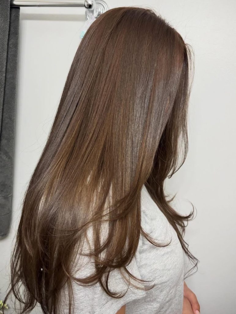An almond-gloss light brown that’s silky from crown to hem, finished with delicate, feathery ends for lift. This is that “great hair day, every day” cut colorists like Kristin Ess champion—effortless but impeccably maintained.