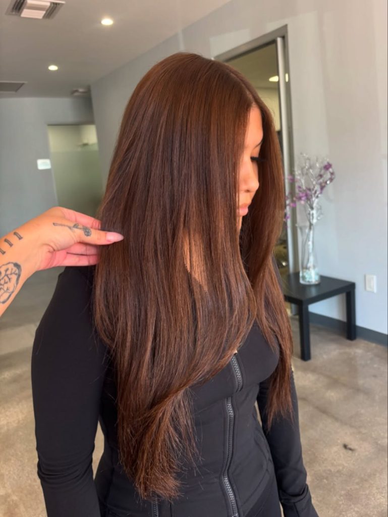 A streamlined blowout shows off long, face-framing layers in a cinnamon-glazed light brown. The finish is ultra straight with a soft flip through the ends, so the color reads even and expensive. The tone sits in warm, cozy shades of chestnut—radiant on medium and olive complexions and still beautifully natural on fair skin when paired with a neutral gloss.
